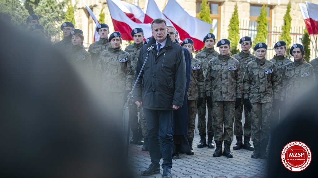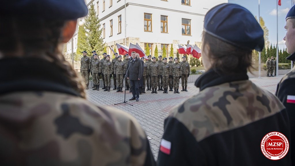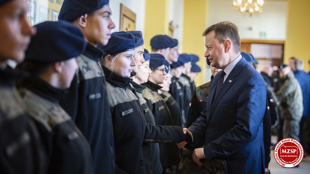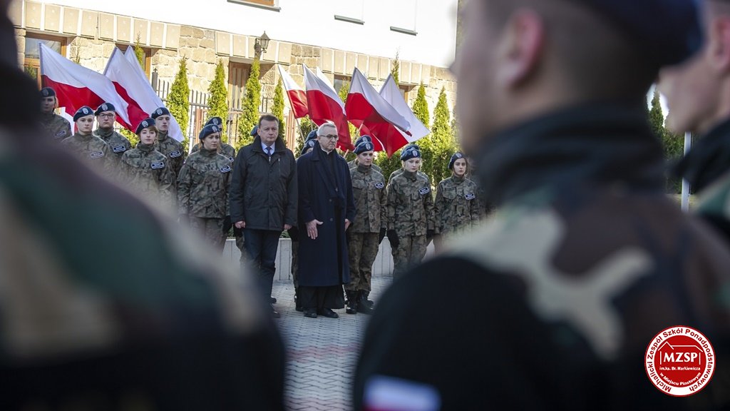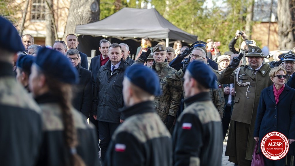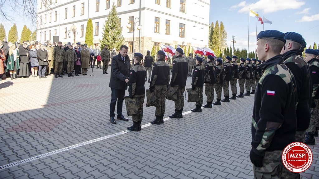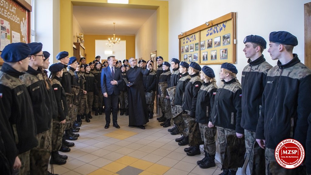 W środę 27 marca 2019 r., w Michalickim Zespole Szkół Ponadgimnazjalnych w Miejscu Piastowym odbyła się Uroczystość Ślubowania Klas Mundurowych Certyfikowanych przez MON. Rangę wydarzeniu nadała obecność Ministra Obrony Narodowej Mariusza Błaszczaka oraz towarzyszących mu Szefów Służb Mundurowych Podkarpacia. W ceremonii brało udział 180 uczniów, natomiast słowa przysięgi pierwszy raz wypowiedziało grono 60 dziewcząt i chłopców. Uczestnikami wydarzenia byli ponadto nauczyciele MZSP, liczne grono rodziców i przyjaciół młodzieży oraz władze Kuratorium Oświaty w Rzeszowie, Województwa Podkarpackiego, Powiatu Krośnieńskiego jak również Gminy Miejsce Piastowe. Obecni byli dyrektorzy szczebla wojewódzkiego instytucji, z którymi współpracuje szkoła, a także siostry zakonne i kapłani. Szef MON wyróżniającym się w szkoleniu uczniom – kadetom, złożył gratulacje, a wszystkim, ślubującym wręczył atrakcyjne upominki. Warto podkreślić, że Minister Obrony dołożył starań, aby po zakończeniu części oficjalnej w kameralnych okolicznościach porozmawiać z każdym uczniem klasy pierwszej mundurowej. Środowe wydarzenia poprzedziła msza św. pod przewodnictwem J.E. ks. abpa Józefa Michalika.