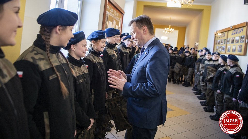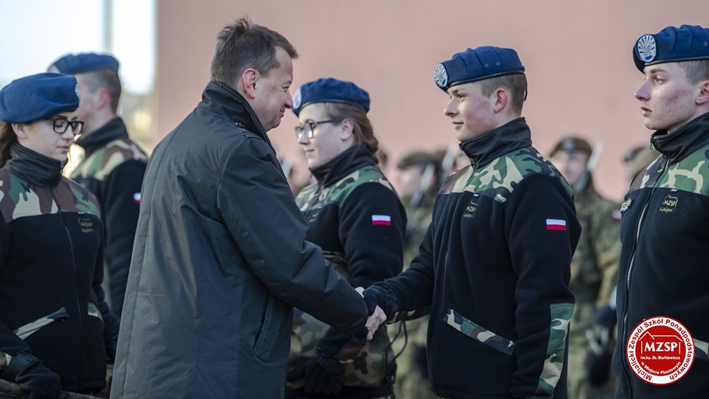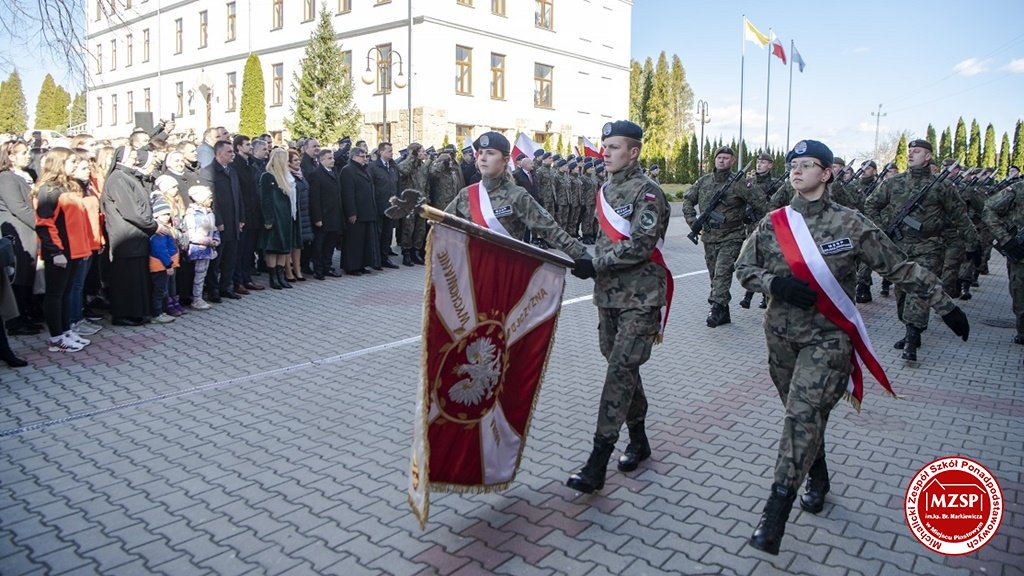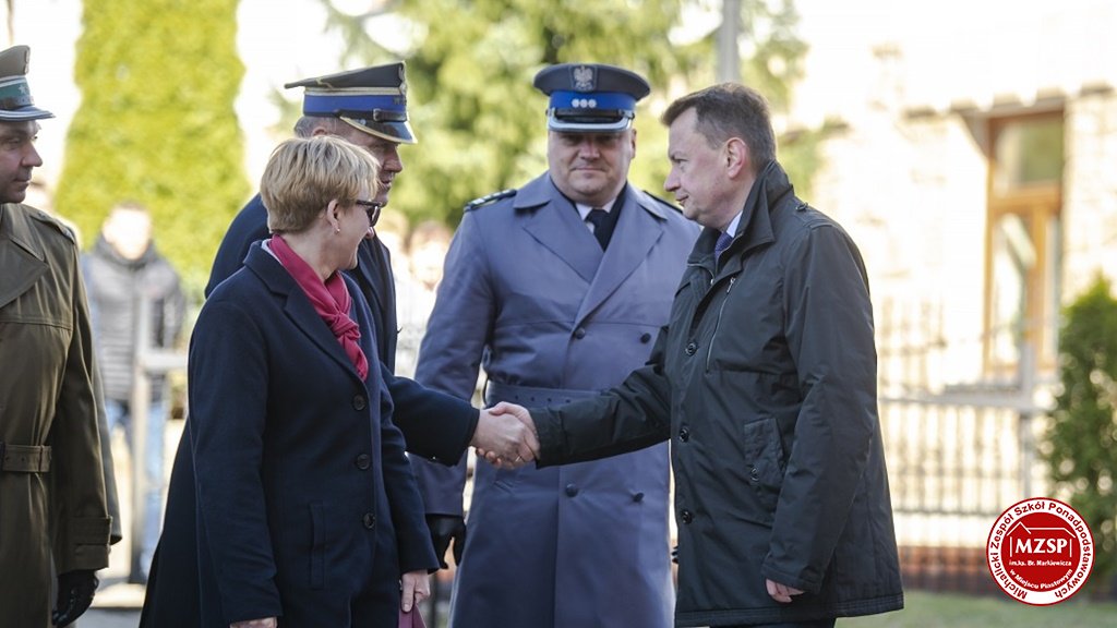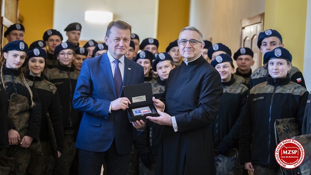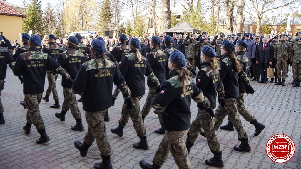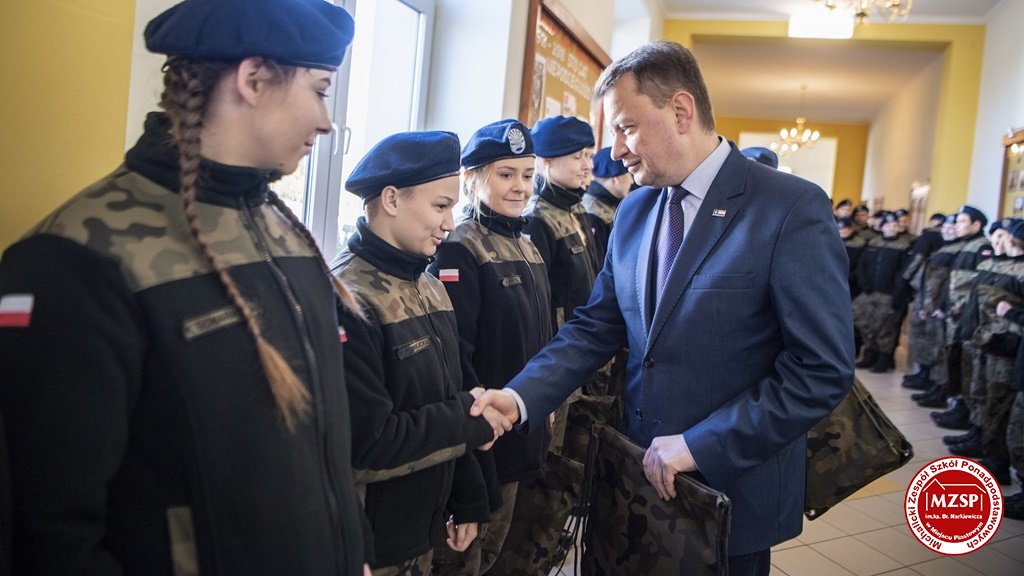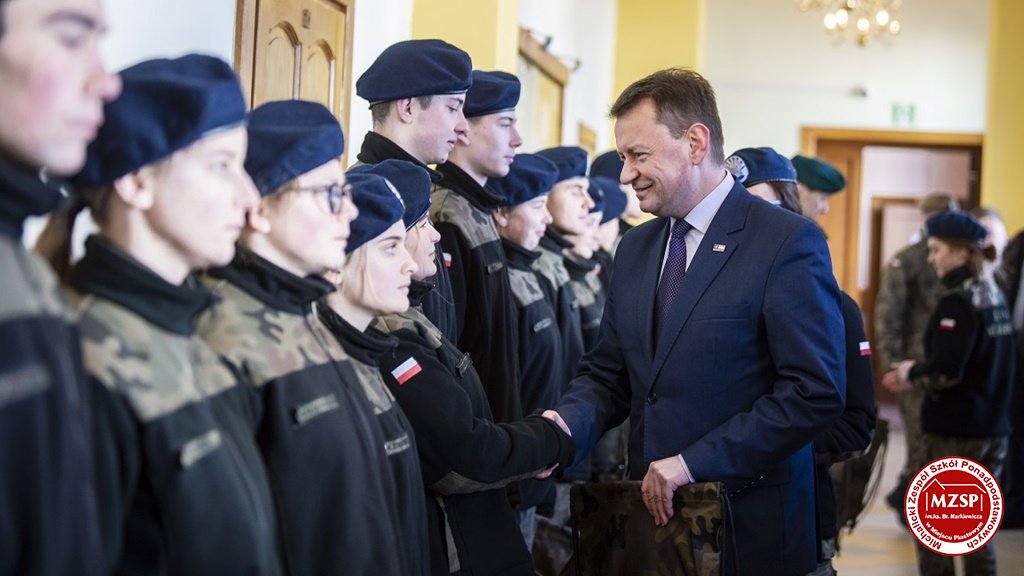 W środę 27 marca 2019 r., w Michalickim Zespole Szkół Ponadgimnazjalnych w Miejscu Piastowym odbyła się Uroczystość Ślubowania Klas Mundurowych Certyfikowanych przez MON. Rangę wydarzeniu nadała obecność Ministra Obrony Narodowej Mariusza Błaszczaka oraz towarzyszących mu Szefów Służb Mundurowych Podkarpacia. W ceremonii brało udział 180 uczniów, natomiast słowa przysięgi pierwszy raz wypowiedziało grono 60 dziewcząt i chłopców. Uczestnikami wydarzenia byli ponadto nauczyciele MZSP, liczne grono rodziców i przyjaciół młodzieży oraz władze Kuratorium Oświaty w Rzeszowie, Województwa Podkarpackiego, Powiatu Krośnieńskiego jak również Gminy Miejsce Piastowe. Obecni byli dyrektorzy szczebla wojewódzkiego instytucji, z którymi współpracuje szkoła, a także siostry zakonne i kapłani. Szef MON wyróżniającym się w szkoleniu uczniom – kadetom, złożył gratulacje, a wszystkim, ślubującym wręczył atrakcyjne upominki. Warto podkreślić, że Minister Obrony dołożył starań, aby po zakończeniu części oficjalnej w kameralnych okolicznościach porozmawiać z każdym uczniem klasy pierwszej mundurowej. Środowe wydarzenia poprzedziła msza św. pod przewodnictwem J.E. ks. abpa Józefa Michalika.