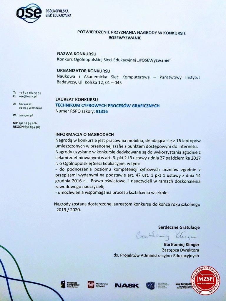W dniu 2 października 2019 r. w Urzędzie Wojewódzkim w Rzeszowie odbyło się wręczenie nagród w konkursie „#OSE Wyzwanie” (Ogólnopolska Sieć Edukacyjna) organizowanego przez NASK – Naukową i Akademicką Sieć Komputerową – Państwowy Instytut Badawczy. Wśród laureatów znalazła się także nasza placówka.