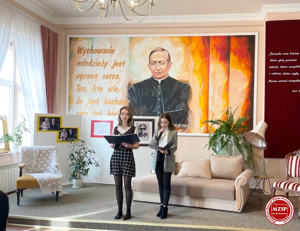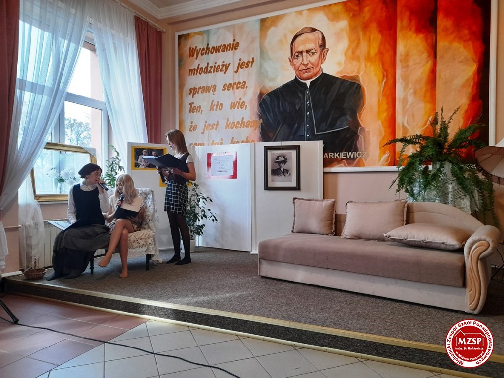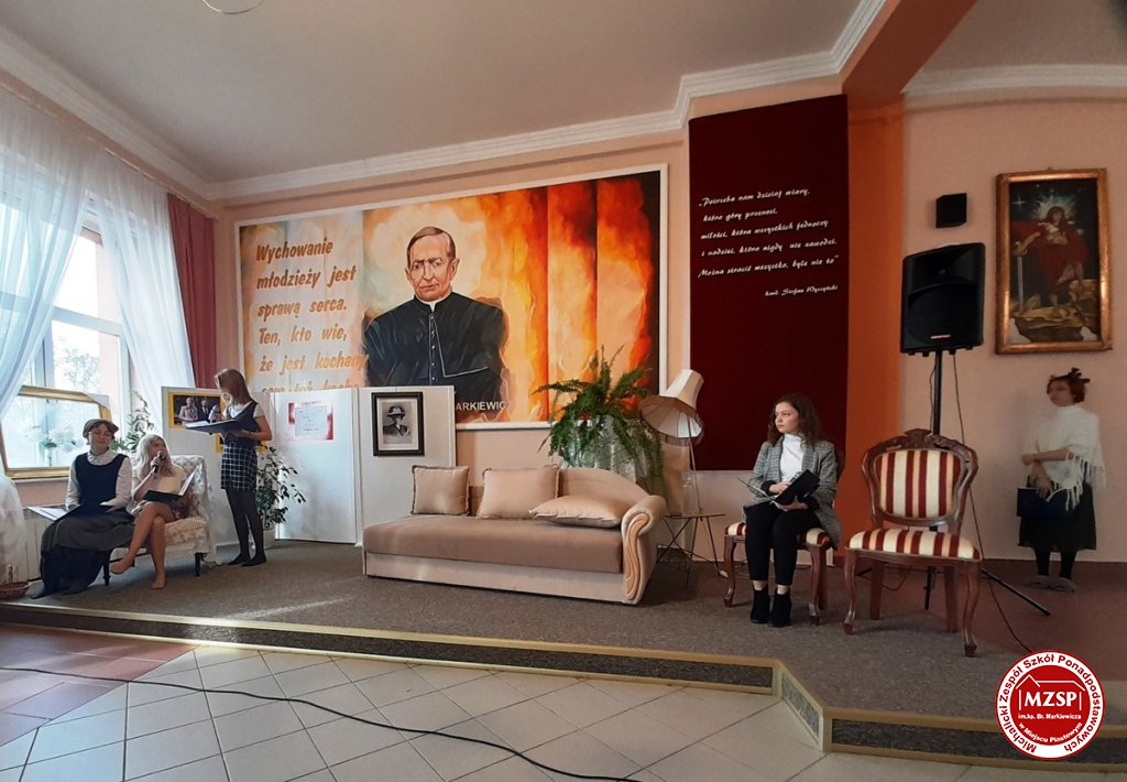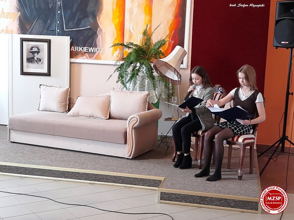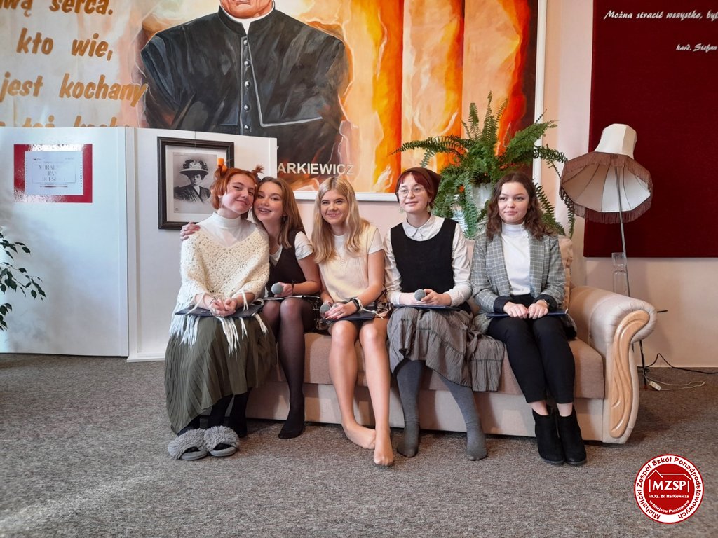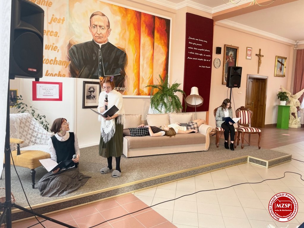 W specjalnie przygotowanej scenografii - saloniku Dulskich odbyło się głośne czytanie fragmentów dramatu. W role bohaterów Gabrieli Zapolskiej wcieliły się: Olga Szwast i Julia Wróbel z II TRD, Aleksandra Wróbel z II LOD ora Jadwiga Gorczyca i Wiktoria Boroń z II LOE.