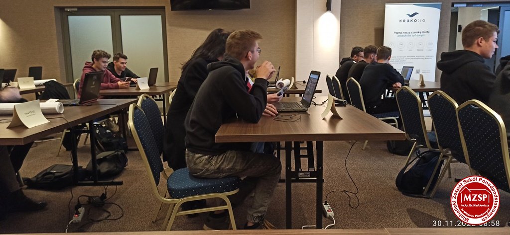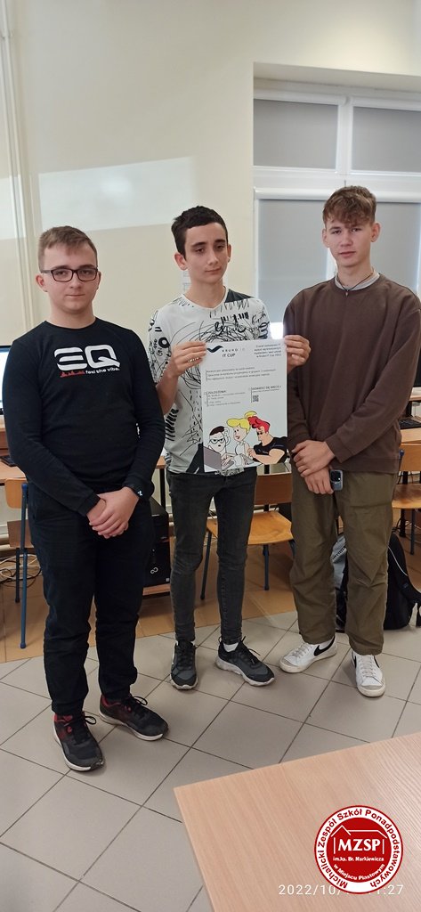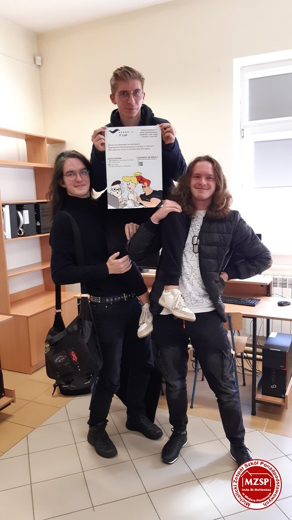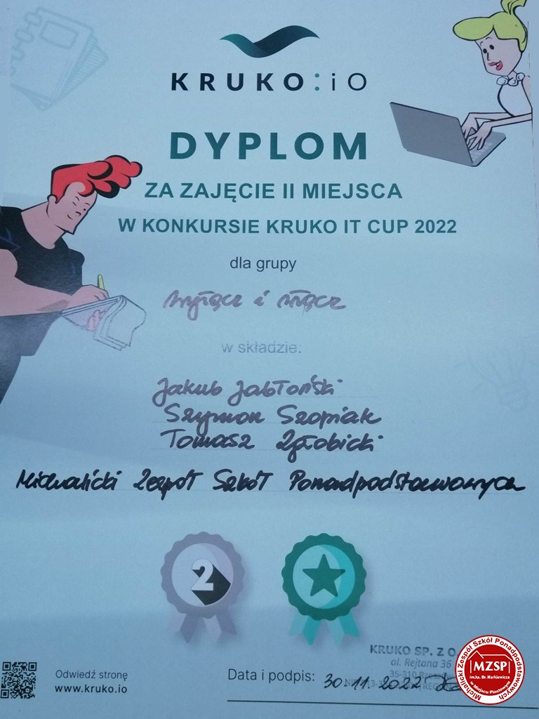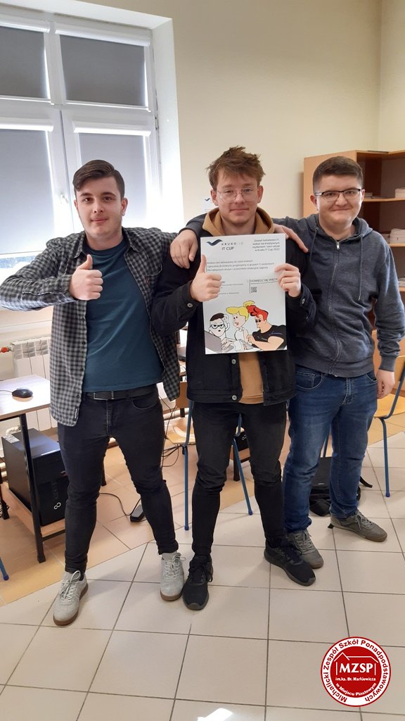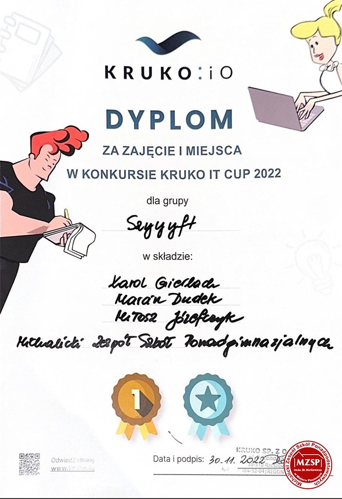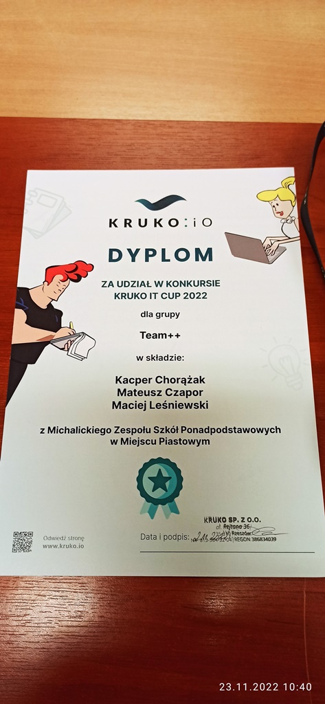 Do Finału wojewódzkiego konkursu Kruko IT CUP z naszej szkoły awansowały trzy drużyny: „Wyłącz i włącz” z klasy 4TIR, „Szyyyft” z klasy 3TI oraz „Szpece z MiZiSiPi” z klasy 4TIA. Finał konkursu odbył się 30 listopada 2022r. w Rzeszowie.