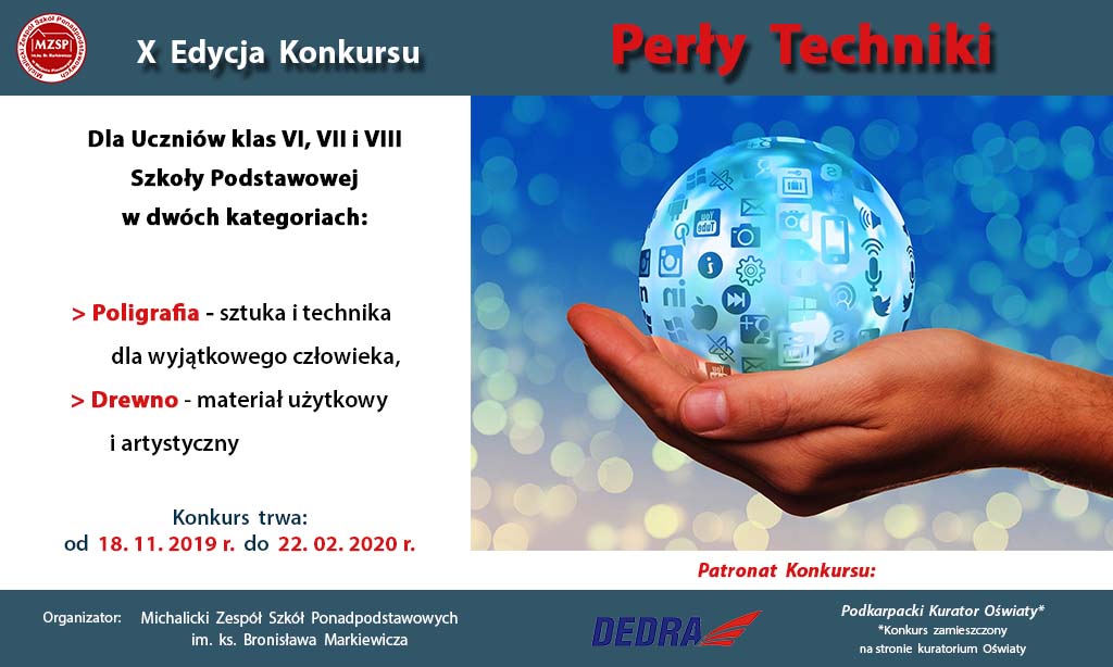 Od 18 listopada 2019 r. do 22 lutego 2020 r. w Michalickim Zespole Szkół Ponadpodstawowych im. ks. Br. Markiewicza w Miejscu Piastowym trwa X Wojewódzki KONKURS DLA MŁODZIEŻY SZKOŁY PODSTAWOWEJ „PERŁY TECHNIKI” w dwóch kategoriach:
